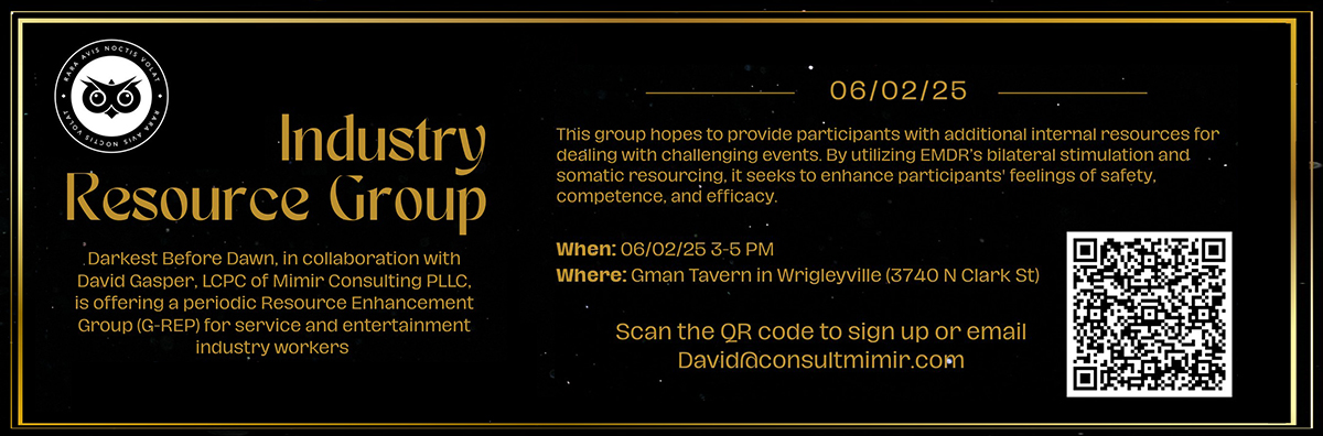 Welcome to Darkest Before Dawn. Launched in 2017, we are a non-profit based in Chicago, with one simple yet urgent goal: to provide resources, support, and community for our nightlife, restaurant and music venue industry, who's late hours and isolated commutes leave them susceptible to depression, addiction and suicide. Recent data points to a high rate of chemical dependency and suicide for this demographic in our country, especially in the very industries built to provide excitement, leisure and happiness to everyone else. They are the people heading home in the early morning hours, when businesses are closed, the streets are empty, and it truly is the darkest period of time before the dawn.